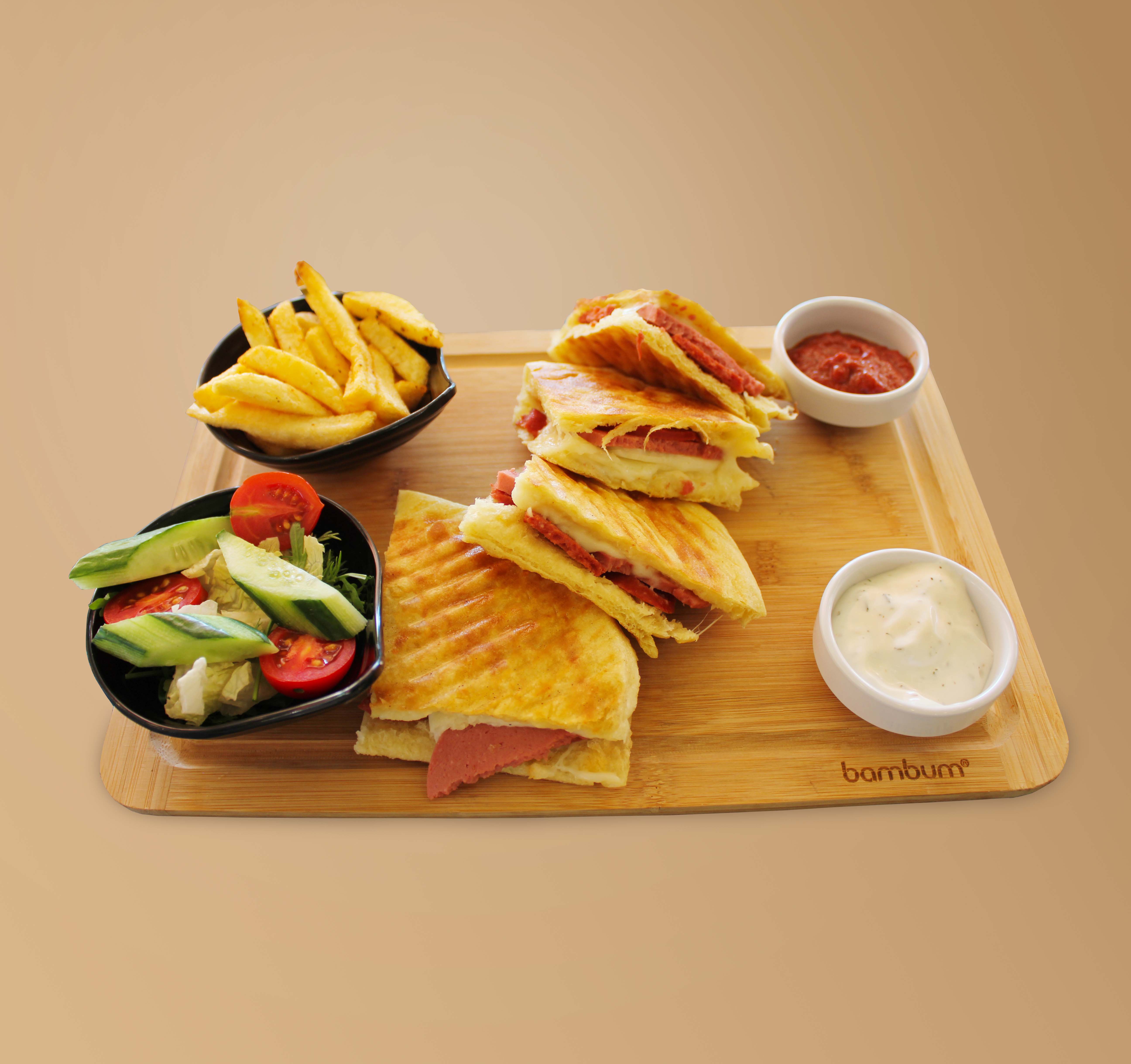 BAZLAMA EKMEĞİ, SUCUK, KAŞAR PEYNİRİ, PATATES KIZARTMAS...