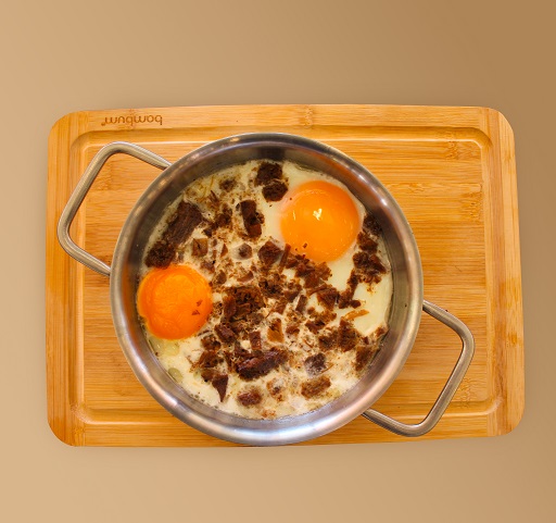 TEREYAĞI VE KASAP SUCUK İLE KIZARTILMIŞ İKİ KÖY YUMURTASI İLE SERVİS EDİLİR.