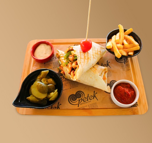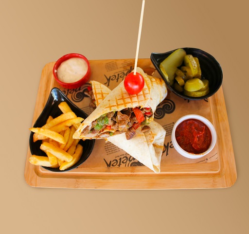 TORTİLLA LAVAŞ EKMEĞİ İÇERİNDE SOTELENMİŞ DANA ETİ, KAPYA KIRMIZI BİBER, YEŞİL KAPYA BİBER, KURU SOĞAN, KAŞAR PEYNİRİ, MEVSİM YEŞİLLİKLERİ, PATATES KIZARTMASI, DOMATES VE SALATALIK İLE SERVİS EDİLİR.