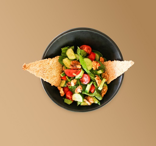 ROKA, DOMATES, NAR, CEVİZ İÇİ, SİYAH ZEYTİN, ZEYTİN YAĞI, LİMON SUYU İLE SERVİS EDİLİR.