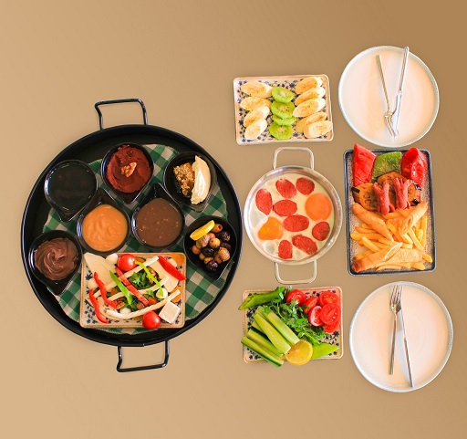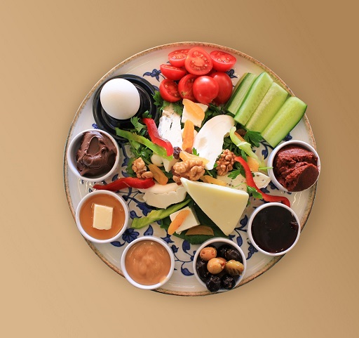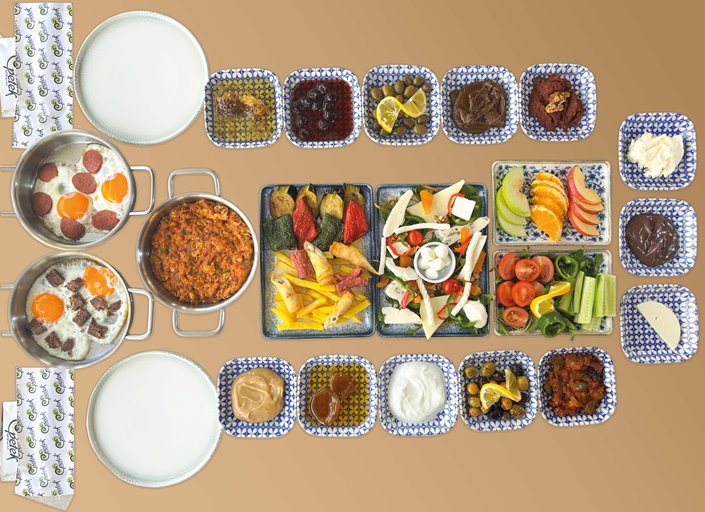 PETEK BAL, TERE YAĞI, KARIŞIK ZEYTİN, SARELLE, REÇEL, SÜT REÇELİ, ÇEMEN, TAHİN PEKMEZ, SUÇUKLU YUMURTA, MEVSİM MEYVELERİ, PATATES KIZARTMASI, SOSİS, KIRMIZI KAPYA YEŞİL KAPYA BİBER, PATLICAN SİGARA BÖREĞİ, SÜT DAMLASI, ÇEÇİL PEYNİR, BEYAZ PEYNİR, AZ TUZLU ÖRGÜ PEYNİRİ, DİL PEYNİRİ, OTLU LAVAŞ PEYNİRİ İLE SERVİS EDİLİR.