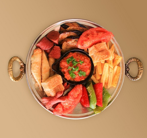 SUCUK, SOSİS,PATLICAN KIZARTMA,PATATES KIZARTMA, KIRMIZI YEŞİL KAPYA BİBER, KÖZ DOMATES, 1 DİLİM SU BÖREĞİ,2 DİLİM SİGARA BÖREĞİ,MENEMEN İLE SERVİS EDİLİR.
