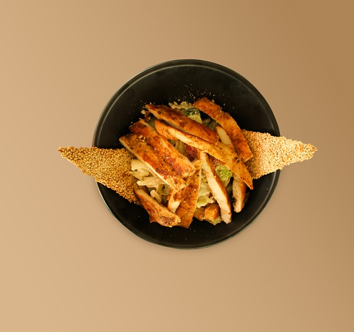 SEZAR SOSU İLE HAZIRLANMIŞ MARUL, DİLİMLENMİŞ IZGARA TAVUK, PARMASAN PEYNİR İLE SERVİS EDİLİR.