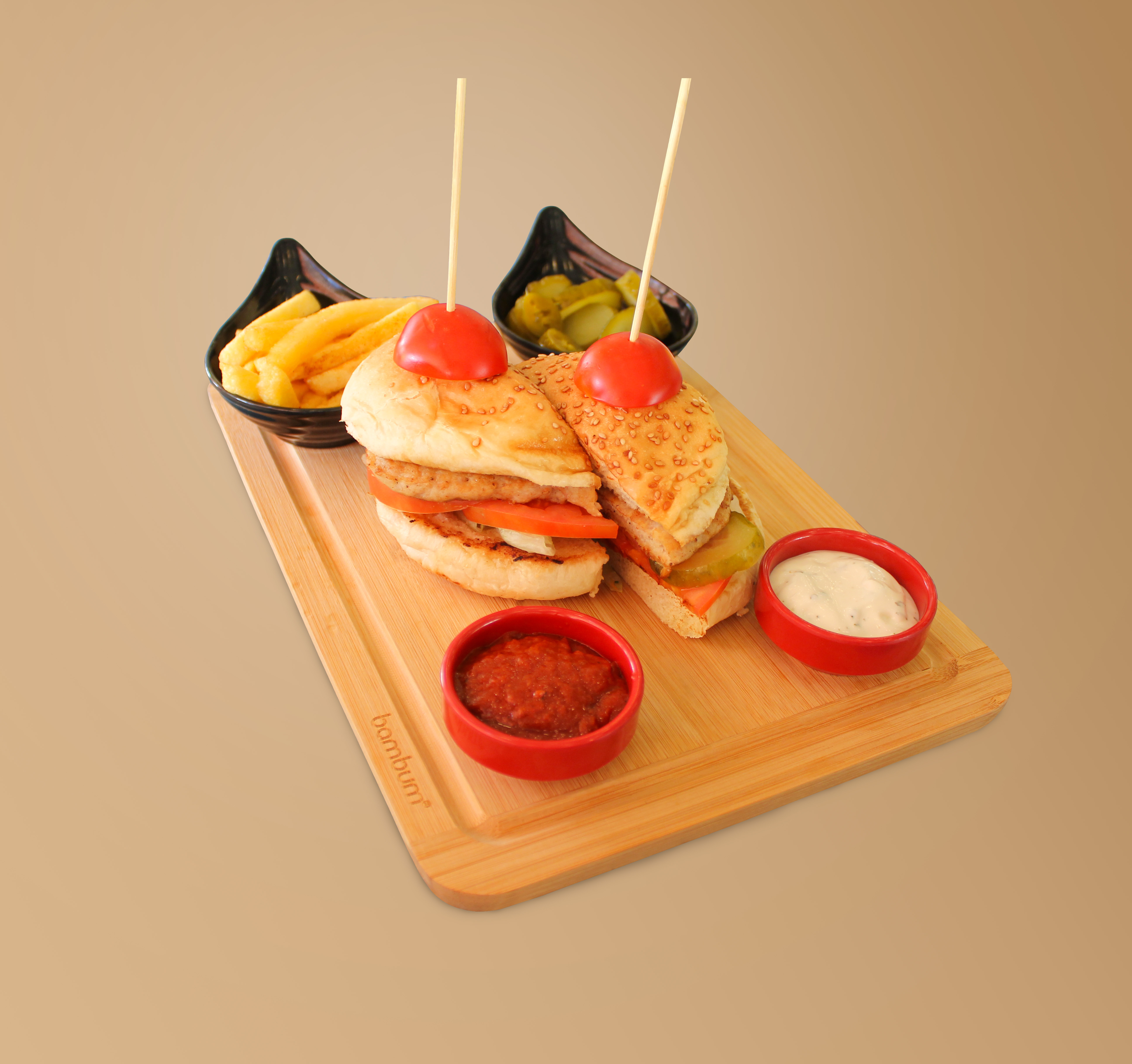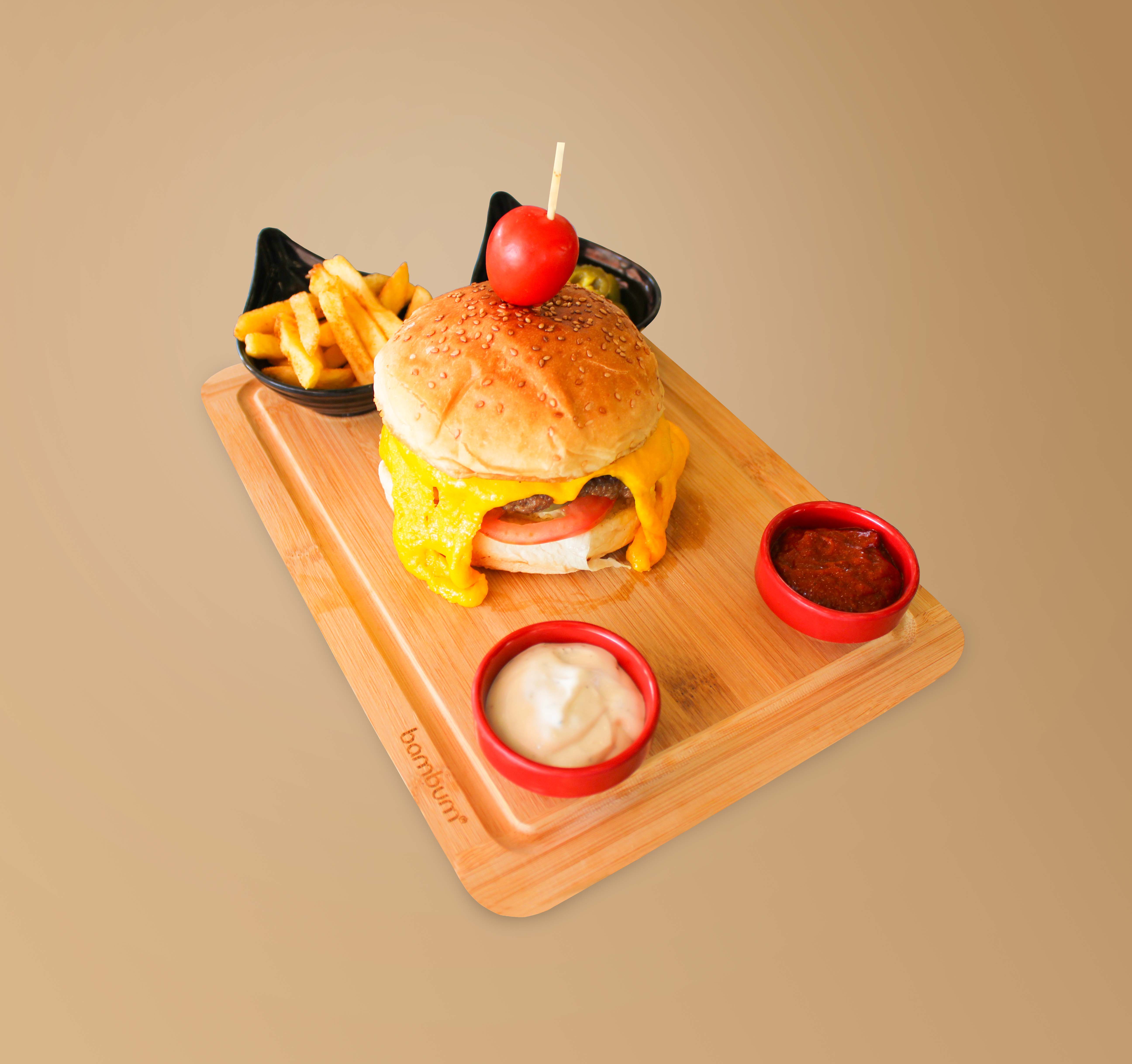 PETEK ÖZEL BURGER KÖFTESİ, MARUL DOMATES, SALATALIK TURŞUSU, IZGARA SOĞAN, CHEDDAR PEYNİRİ, PATATES KIZARTMASI VE DİP SOS İLE SERVİS EDİLİR.