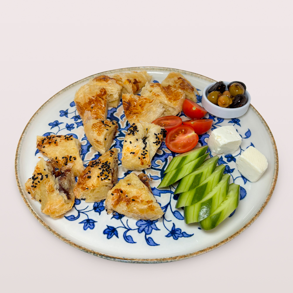 KIYMALI KOL BÖREĞİ 1,5 PORSİYON, DOMATES, SALATALIK VE 2 ADET ÇAY İLE SERVİS EDİLİR.