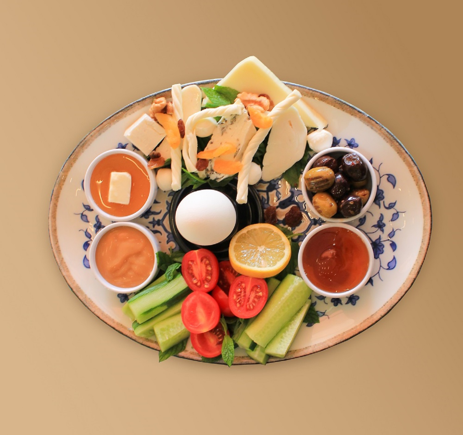 PETEK BAL, TERE YAĞI, KARIŞIK ZEYTİN, SARELLE, REÇEL, SÜT REÇELİ, ÇEMEN, TAHİN PEKMEZ, SUÇUKLU YUMURTA, MEVSİM MEYVELERİ, PATATES KIZARTMASI, SOSİS, KIRMIZI KAPYA YEŞİL KAPYA BİBER, PATLICAN SİGARA BÖREĞİ, SÜT DAMLASI, ÇEÇİL PEYNİR, BEYAZ PEYNİR, AZ TUZLU ÖRGÜ PEYNİRİ, DİL PEYNİRİ, OTLU LAVAŞ PEYNİRİ İLE SERVİS EDİLİR.