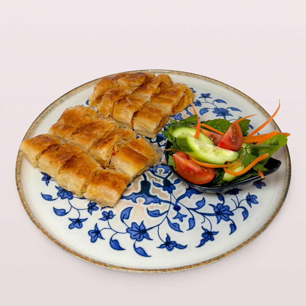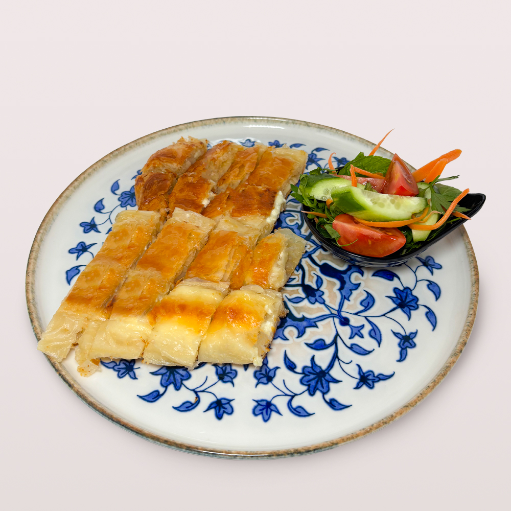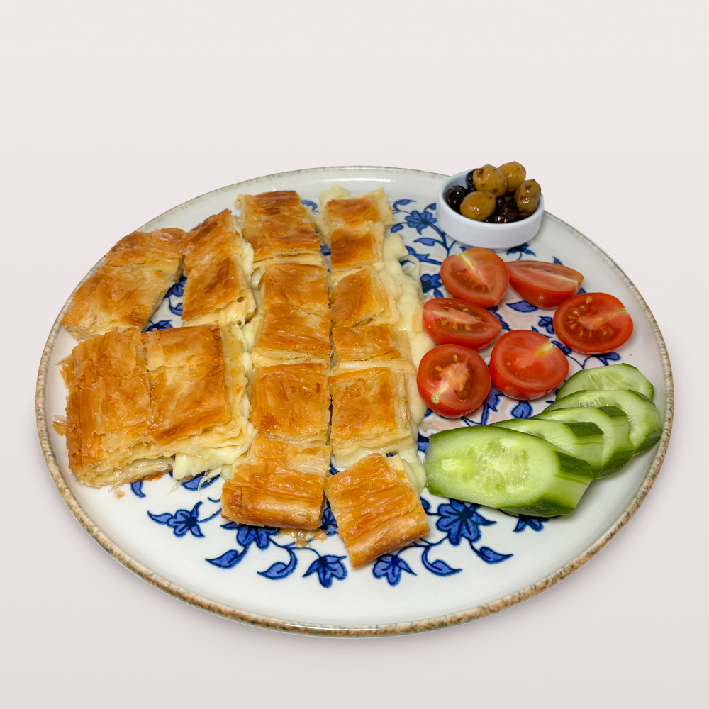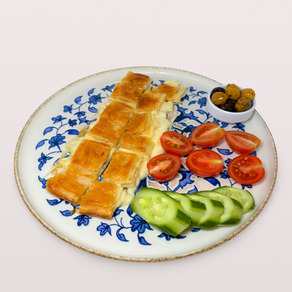 SU BÖREĞİ 1,5 PORSİYON, DOMATES, SALATALIK, ZEYTİN VE 2 ADET ÇAY İLE SERVİS EDİLİR.