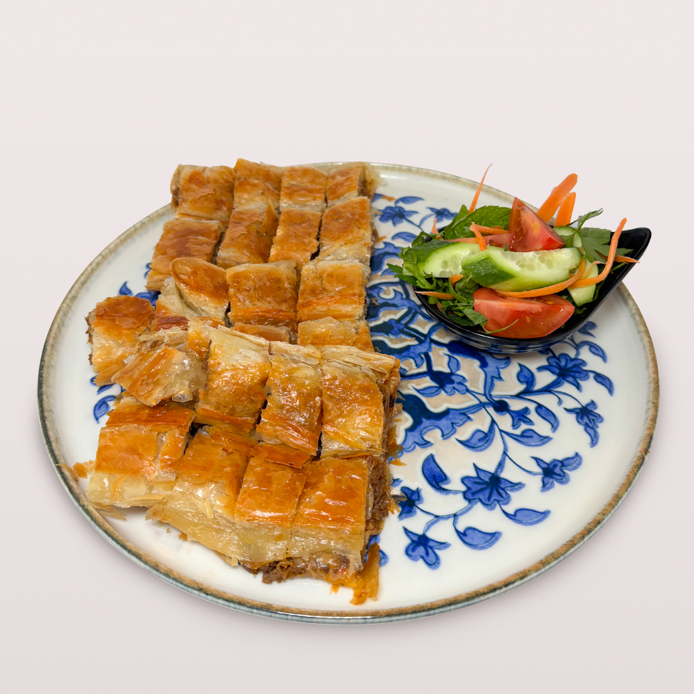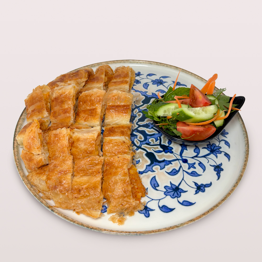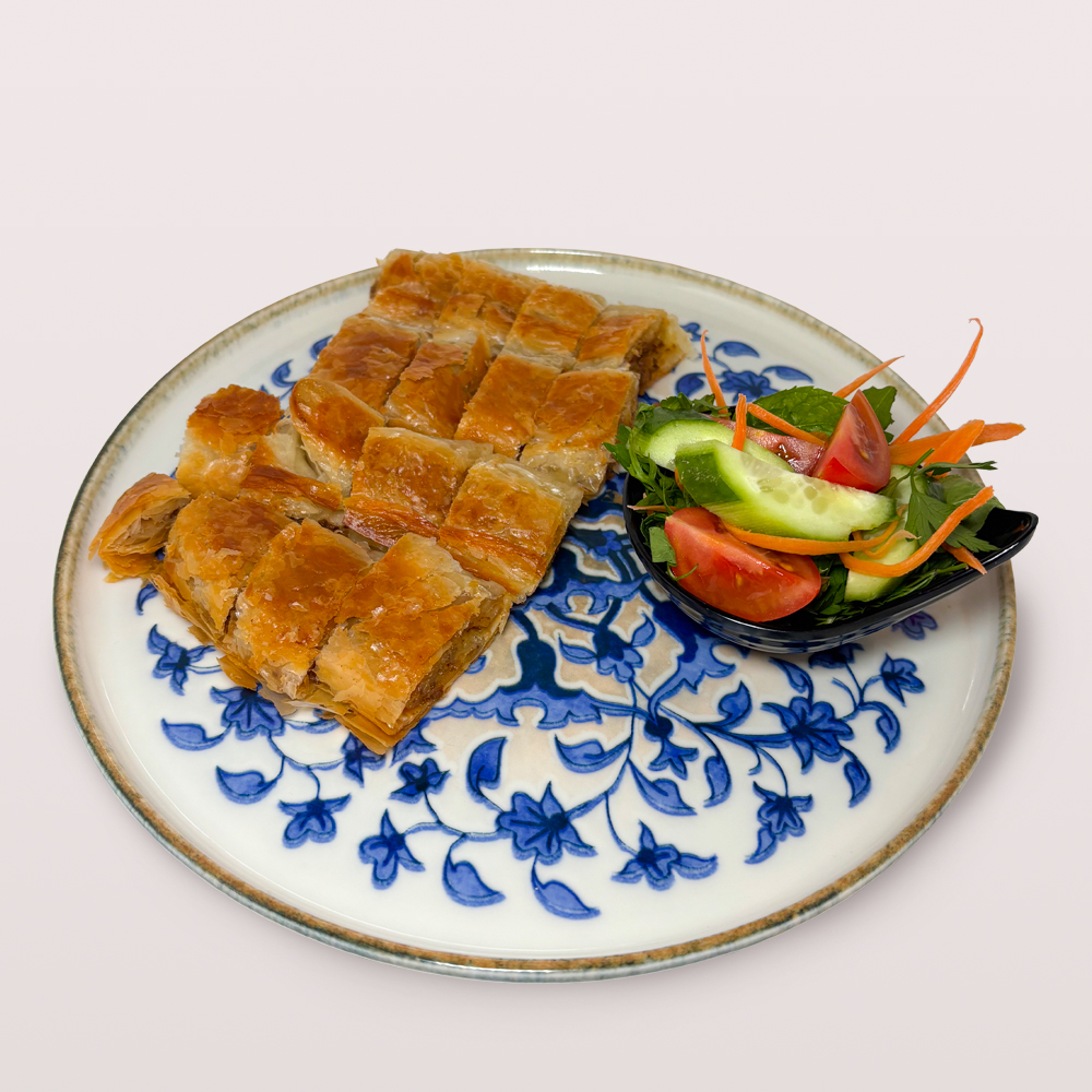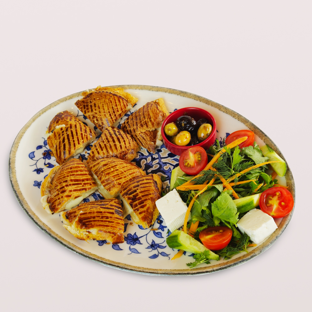 SU BÖREĞİ 1,5 PORSİYON, DOMATES, SALATALIK, ZEYTİN VE 2 ADET ÇAY İLE SERVİS EDİLİR.