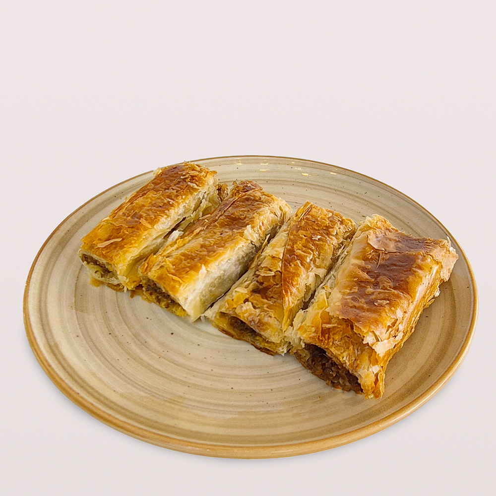 KIYMALI KOL BÖREĞİ 1 PORSİYON,DOMATES, SALATALIK VE 1 ADET ÇAY İLE SERVİS EDİLİR.