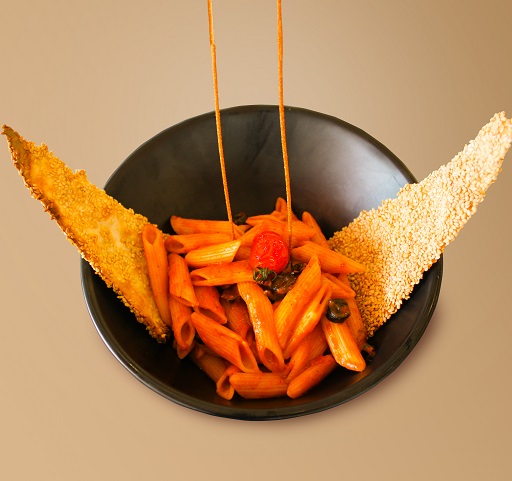 PENNE MAKARNA, SİYAH ZEYTİN, ACI SOS, PARMASON PEYNİR İLE SERVİS EDİLİR.