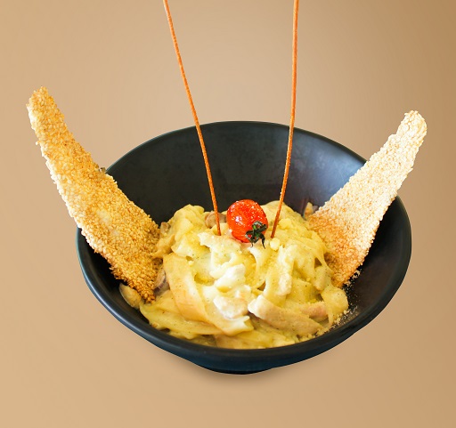 PENNE MAKARNA KREMASI, KÜLTÜR MANTARI, KÖRİ BAHARATI İLE SERVİS EDİLİR