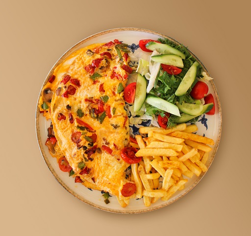 İKİ YUMURTA İLE HAZIRLANMIŞ OMLET, PATATES KIZARTMASI, MEVSİM YEŞİLLİKLERİ, DOMATES, SALATALIK İLE SERVİS EDİLİR.